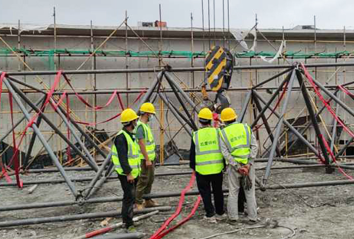 3、華亭煤礦網(wǎng)架工程開(kāi)工前須組織人員勘察現(xiàn)場(chǎng),復(fù)核軸線尺寸及預(yù)埋件的標(biāo)高、平面位移是否符合設(shè)計(jì)要求。
